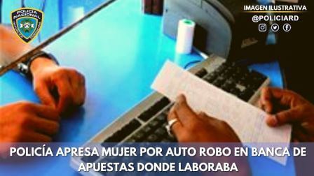 La Policía Nacional apresó a una mujer acusada del auto robo de 75 mil pesos de la banca de lotería en la cual laboraba, en un hecho ocurrido en n el sector Los Frailes II, en Santo Domingo Este.
