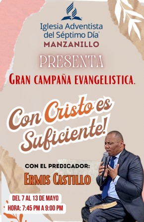 Manzanillo, Montecristi. – La Iglesia Adventista del Séptimo Día de Manzanillo se complace en invitar a la comunidad del municipio a participar en la campaña evangelística «Con Cristo es Suficiente», que se llevará a cabo del 7 al 13 de mayo de 7:45 a 9:00 de la noche, en las instalaciones de la iglesia adventista del Séptimo Día. El objetivo de la campaña es presentar a Jesucristo como la respuesta suficiente a todas las necesidades y problemas de la vida, y promover la fe en él como el camino hacia la salvación y la vida eterna.